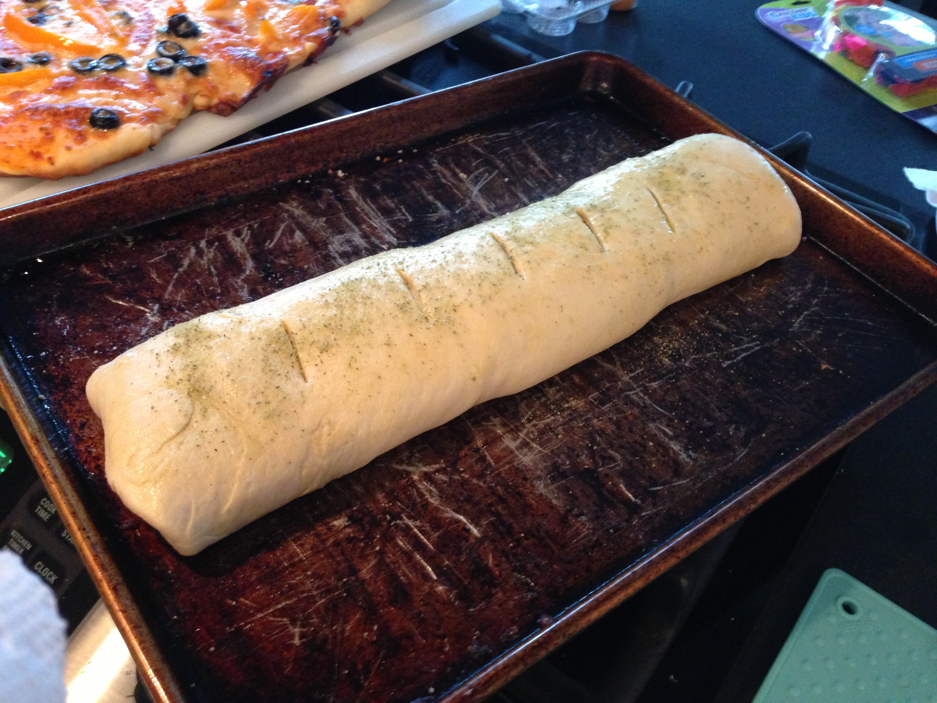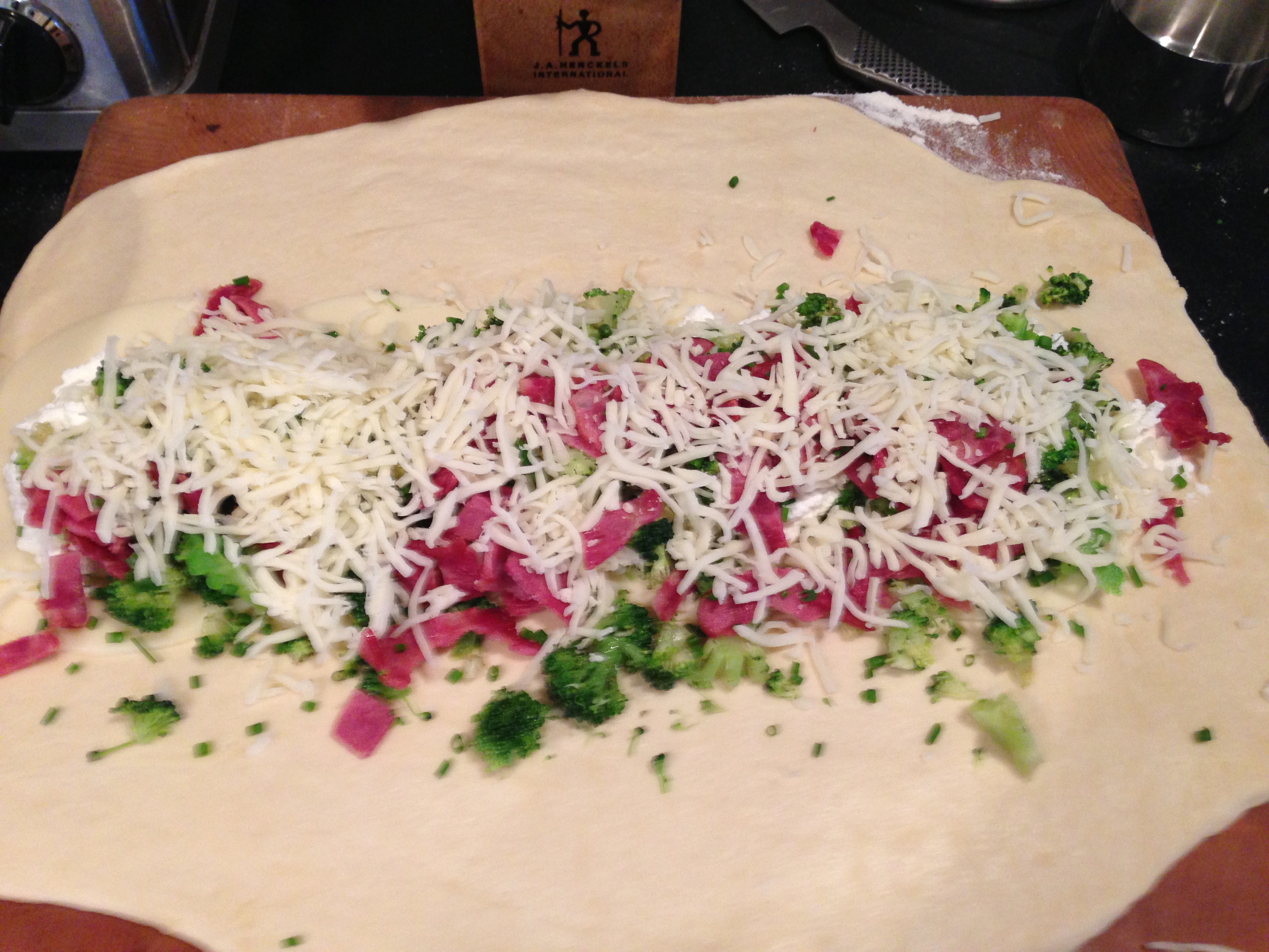 Roll out a piece of pizza dough into a rectangle